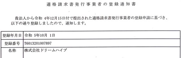 適格請求書等保存方式(通称:インボイス制度)が、令和5年10月1日から開始されます。それにあたり適格請求書(インボイス)を発行するために必要な「適格請求書発行事業者」の登録申請を行いました。この度、令和4年12月26日付けで適格請求書発行事業者へ登録されたことをお知らせいたします。