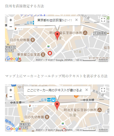 [map addr="東京都杉並区荻窪5-21-11" lat="35.703700" lng="139.619586"]ここにマーカー用のテキストが書けるよ[/map]