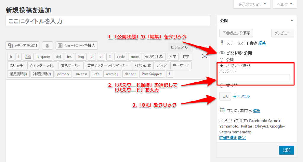 WordPressの投稿や固定ページにある、ページの「公開」情報からパスワードを設定する方法です。